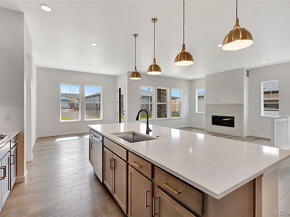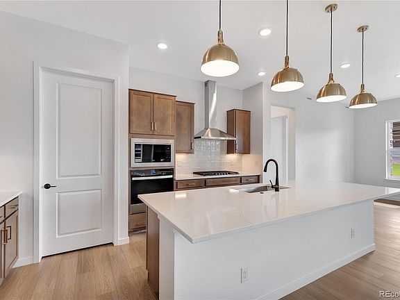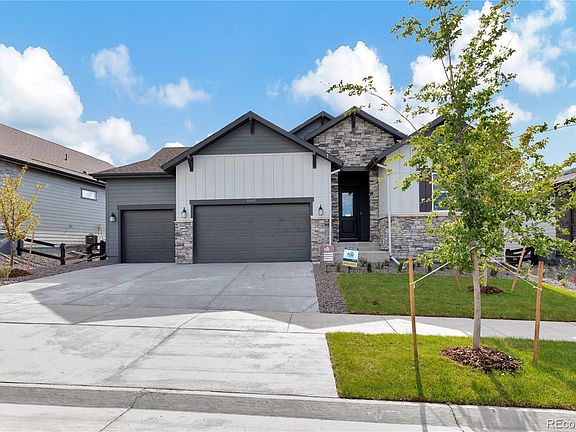As you enter this light-filled home, you’ll be greeted by soaring ten-foot ceilings leading to a fantastic open-concept great room. There is a large bedroom and secondary bathroom with a tall tub/shower surround immediately to your left. Past that is a flex room/den, perfect for a home office or craft room. The kitchen is designed for modern lifestyles, with a spacious island facing the gathering room and a spacious dining area adjacent to a glass door leading to the large covered patio. Stained slate cabinets, designer white hexagonal tile backsplash, built-in oven with microwave above it, and separate gas cooktop with stylish range hood add understated elegance to the room. Adjacent to the kitchen is a spacious gathering space, with a cozy fireplace, where family members can play games, read, or relax after a long day. This well-appointed ranch floor plan features 2 bedrooms plus a den with French doors. The primary bedroom is spacious and light with large windows bringing in tons of sunshine. The perfect sanctuary, it adjoins a luxurious bathroom, which features a walk-in, tiled shower, large linen closet, and well-appointed walk-in closet with double racks and a window for fresh sunlight. The 1,366 square feet finished basement offers more space to enjoy with family and friends. if you so desire, including 2 additional bedrooms, a bathroom, and a living area. Enjoy stunning views to the west and open space, adding to the home’s appeal. 3 car garage. This home has it all! Space, privacy, luxury, and modern amenities all in a wonderful 55+, active lifestyle community located in a highly desirable location.