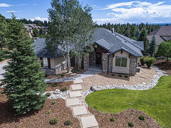 Come experience this beautiful custom ranch style home sitting on just over half an acre. Perfectly situated among the Quaking Aspens, Colorado Spruce and Ponderosa Pines. The main level is a perfect blend of style and convenience with an office, formal dining room, family room and an island kitchen with a breakfast nook. The kitchen is fully equipped with beautiful Knotty Alder cabinets, granite counters and stainless appliances. Appliances include double ovens, microwave, refrigerator and a 5 burner gas cooktop. The covered deck is the place to enjoy cookouts, mountain views and nightly sunsets. The walkout basement has 3 additional bedrooms, 2 bathrooms as well as a rec room, TV room, wet bar and plenty of storage. There is a nice quiet patio off the basement for guests or additional entertaining space. The large 3 car garage is fully finished and provides easy access into the home. Situated in the heart of the Timbers Neighborhood. Measurements are approximate.