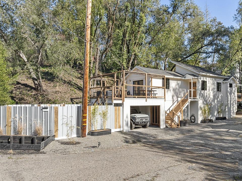 No Expense Spared on this Russian River Stunner! The owners have meticulously crafted a home that embodies flow & ease. Elements of Japanese zen, color and minimalism appear throughout. Every inch of this magical property was custom built & remodeled over the past year. All New plumbing, electrical, mechanical, siding, roofing, decking, windows, doors, LVP flooring, bathrooms, kitchen, 18x16 garage w/EV, fencing & landscaping. Vaulted ceilings throughout give size and scale. The open kitchen & living space offers a built-in custom bar with seating for four or a designated work space. With the bedrooms on opposite ends of the home, privacy & peace abound. The master suite features a sizeable closet w/ extra storage and opens through french doors onto your private patio w/connecting catwalk. Bedroom two opens onto the larger 300 sq ft deck that features a hot tub, plenty of room for outdoor dining and direct access to the privacy fenced, low maintenance yard w/ fire pit & outdoor movie screen. Extremely sunny lot with easy road access & parking. Location! Location! Walking distance to the Russian River, Speers Market & Steelhead Beach. Minutes from Downtown Forestville. Guerneville, Santa Rosa & Sebastopol all w/i 15 minutes. Full time or vacation living this one is Truly Turn-Key!