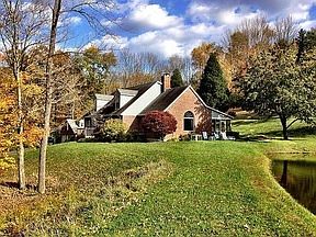 Full brick Cape Cod w/4 BDR on 12.62 private hilly acres, stocked pond, woods. 1st flr master & bath; living rm w/fireplace overlooking pond; formal dining; rear screened porch; extra sitting rm; sml. front deck; 2 car gar.; detached 2 car gar. with electric & windowed loft; eat-in kit. w/granite counters; 3 bdrms./2 baths up; nr 2 golf courses.