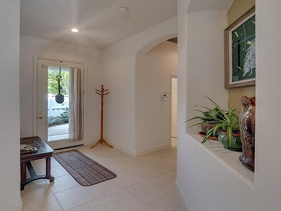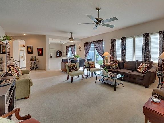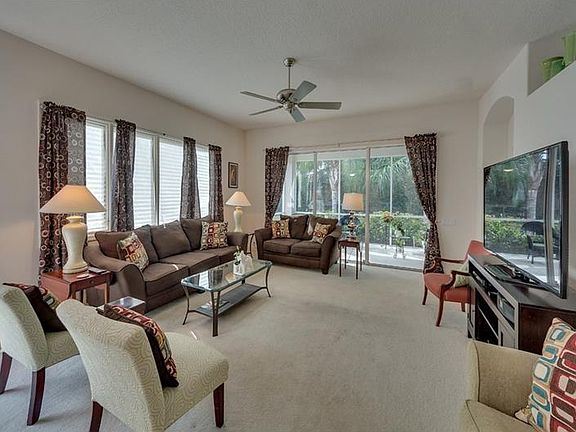 Maintenance-free living ~ No CDD Fees ~ OPTIONAL recreational memberships, gated community and private view. This home has been "gently" used as a wonderful vacation getaway for owners for several years. Now they are making Florida their permanent residence and are planning on something even larger to suit their needs, but this home has served them well and they are sure it will you also! 2 bedrooms, 2 baths plus den. Open great room plan. Neutral colors of paint, carpets and tile are perfect for any décor! Eat-in kitchen with large walk-in pantry and breakfast bar, solid surface countertops and gas stove. High ceilings, rounded corners, decorative arches. Double doors to den/music room with beautiful laminate flooring. Master suite offers wall of thermal windows and peaceful view. Master bath with Roman shower, double vanities, decorative tile and spacious walk-in closet. Split plan allows guest privacy. Inside utility with wet sink - washer and gas dryer will convey. Oversized side courtyard patio invites the Florida sunshine - perfect for outdoor entertaining and tropical plantings along with screened-in lanai off the great room. This home is easy to show with some notice. Call today!