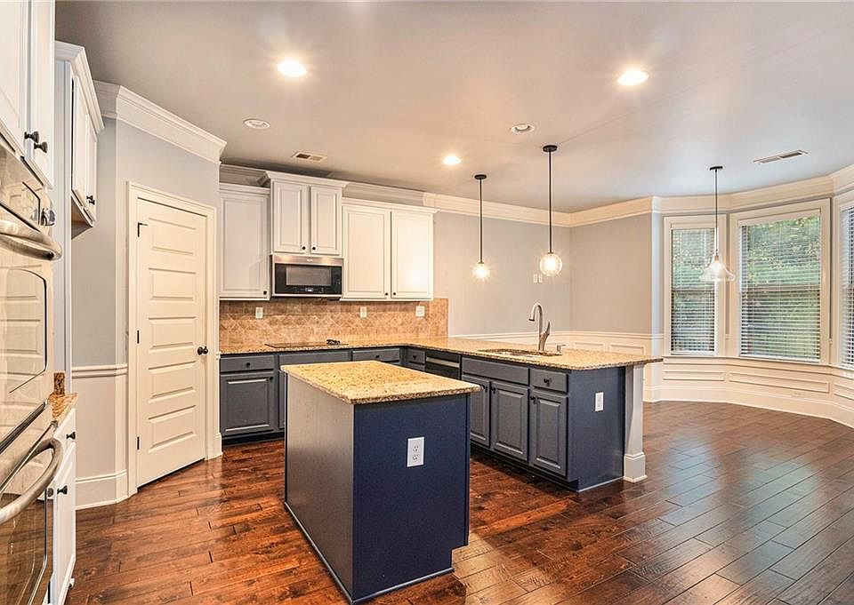 - Features: Cabinets Stain, Eat-in Kitchen, Kitchen Island, Pantry Walk-In, Solid Surface Counters, View to Family Room