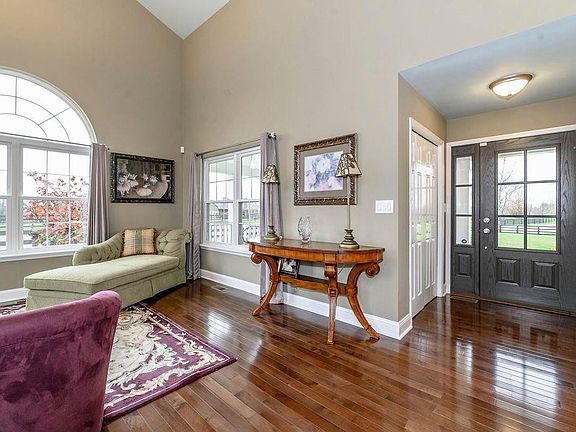 Equestrian's Dream! This lovely property is located in The Ridings, an equestrian residential development with riding path, only minutes from Winchester and 15 min from Lexington. The immaculate 4 bedroom, 2.5 bath home on 5 acres is surrounded by 3 paddocks & 4-plank fencing. The equestrian in the family will love the 20x50 meter dressage arena that was constructed with the highest of standards from the footing to the french drain system. The barn has 2-14x12 & 1-11x10 stalls with mats, heated/cooled tack room, heated grooming aisle, & shed for equipment storage. The sellers have remodeled every foot of the beautiful home; all new windows/doors/flooring, new roof 2017, remodeled kitchen w/stylish Martha Stewart cabinets/stainless appliances & completely remodeled baths. The main level has a sun-filled formal living room, formal dining room, half bath, laundry room, & great room with wonderful views. The second floor has 3 bedrooms, guest bath, primary bedroom w/bath & walk-in closet.