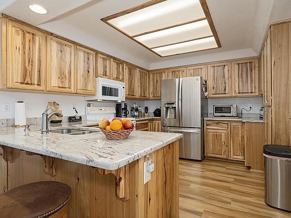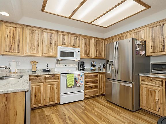 This immaculate home is in pristine condition. Featuring over 1600 sq. ft of living space, three bedrooms and bathrooms. As you walk in you will notice the myrtle wood hardwood floors, huge living room with natural light flowing in. Recessed lighting provides the perfect ambiance. The kitchen has granite counter tops with hickory cabinets and slide outs. There is an undermount kitchen sink. Plenty of cabinets and counter space as well as a breakfast bar and eating area. There are three large bedrooms with the master bedroom having a walk in closet and beautiful bathroom. Both bathrooms have custom tile work. This home features gas heat and gas water heater new in 2022.. Outside you will find a covered patio, hot tub in a gazebo and perfectly manicured lawns. In 2021 leaf guards were installed in the gutters. This home shows the pride of ownership.