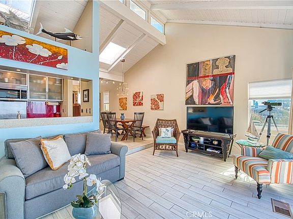 Spectacular ocean and Catalina views from this beautiful Arch Beach Heights home featuring 3 bedrooms and 3 baths, with one of the bedrooms on the main level, with a full bath. From the moment you walk in you will appreciate the floor to ceiling ocean view, tongue and groove vaulted ceilings, and an abundance of natural light. Open floor plan, a large living room and deck, and the kitchen and dining room also enjoy the beautiful ocean views. Downstairs, there is a large primary suite with sit-down ocean views, a spacious bath offering dual sinks and a step-in shower, and a second, large deck. The third bedroom down the hall has a recently updated, full bath. Additional features include dual-glazed vinyl windows and tile flooring throughout. Two-car, direct access garage with only two steps to the kitchen and plenty of guest parking. Terrific storage throughout and an individual laundry room. Close-by is Moulton Meadows Park with grassy fields, basketball and tennis courts, a playground, picnic area with bbq's, and adjacent to incredible hiking and biking trails.