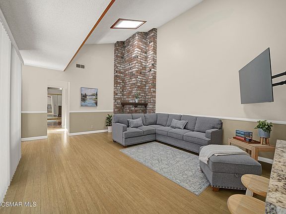 This charming single-story home in the desirable Laurelwood tract offers 2 bedrooms, 2 bathrooms, and 1,232 sq. ft. of comfortable living space. With its neutral tones, abundant windows, and vaulted ceilings enhanced by skylights, the home feels bright, airy, and inviting. Inside, you'll find rich wood flooring, upgraded windows and slider, and a stunning full-length brick fireplace that anchors the spacious family room. The sizable eat-in kitchen features granite counters, a custom tile backsplash, recessed lighting, and stainless-steel appliances—perfect for casual meals or entertaining. The large primary suite includes double closets for ample storage, while the secondary bedroom is equally generous in size. Both bathrooms have been beautifully upgraded with tile floors and walls, skylights, modern vanities, and stylish fixtures. Step outside to your own private retreat: a tropical backyard oasis with mature trees, multiple seating areas, and plenty of shade for relaxation. The expansive side yard also includes a spa for added enjoyment. Conveniently located near top-rated schools, parks, and shopping, this home combines comfort, style, and convenience in one of Camarillo's most sought-after neighborhoods.