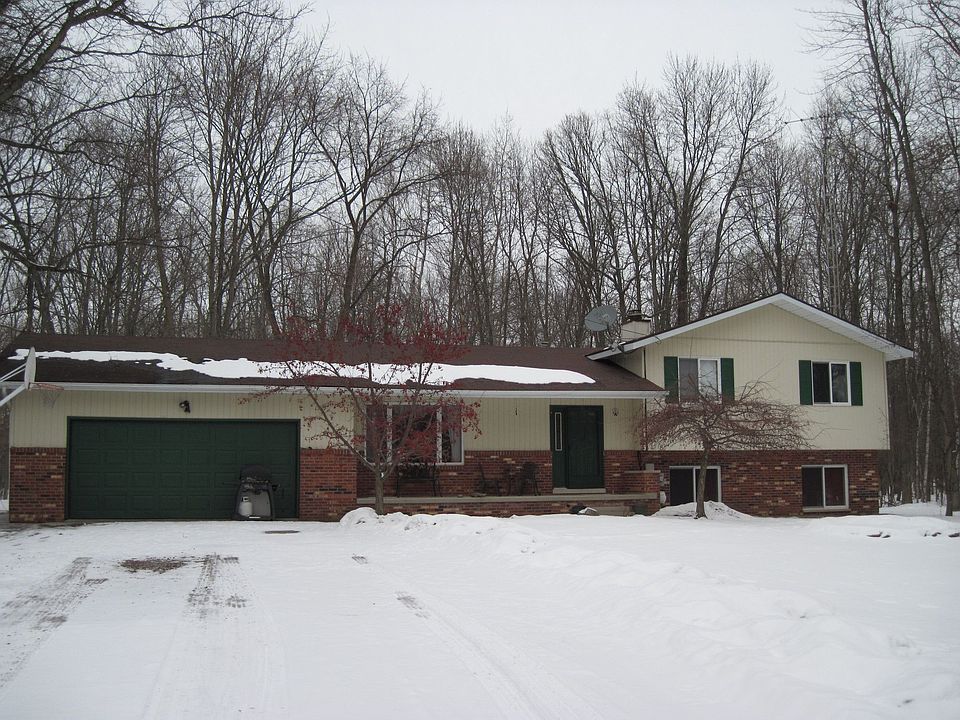Refreshing country setting on 8.26 private wooded acres with trails. The man haven includes two 30x40 pole barns. Comfortable well maintained home features, ceramic kitchen and dining area with Andersen sliding door to view out to the deck & woods. Large family room with fireplace and bookcases. Full front porch to sit and watch the play areas. Master suite has 2 walls of closets and bath access. High efficient furnace, partly finished basement.