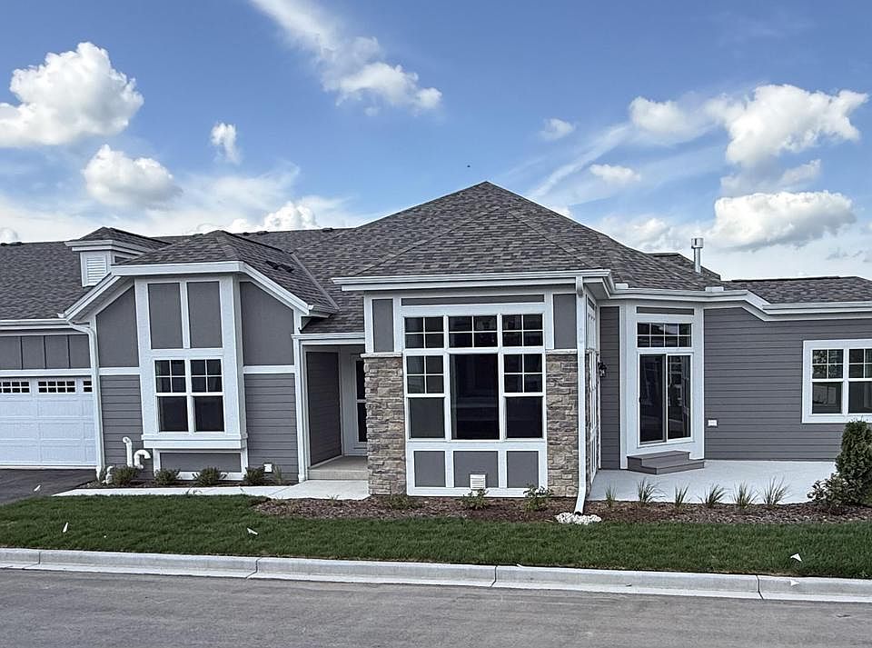 Gorgeous 3 CAR GARAGE 2BR/2BA ranch condo with open & airy floor plan offering luxury finishes and large windows throughout. Great room with gas fireplace, Sunroom, & MBR boast 10'ceilings. Kitchen with large center quartz island for entertaining. Sunny den/office for your 'work at home' needs, crafting, or library. Impressive Owner Suite features double vanity quartz countertop with Kohler sinks, linen and WIC, tiled shower. Convenient spacious first floor laundry w/ sink and additional WIC. Lower level with plenty of room to finish, plumbed for full bath. Beautiful Clubhouse with a kitchen and great room perfect for hosting parties, plus a pool, pickle ball and bocce courts. Move in and enjoy all of these amenities this Summer!