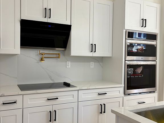 Upscale kitchen with quartz countertops, refrigerator, dishwasher, built-in microwave, and oven.