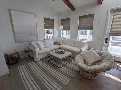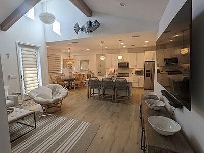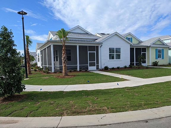 Move in ready, much sought after model, Dreamsicle Cottage awaits in Latitude Margaritaville! An exclusive "55 and Better" resort-style gated community located just minutes from the beautiful emerald waters and white sands of Panama City Beach and all the fun of 30 A. This Dreamsicle cottage in Phase 2 sits on a PREMIUM corner lot (not an interior lot-this one is truly unique), with a covered screened-in porch that is relaxing and perfect for morning coffee, or afternoon margaritas! So many upgrades that include gorgeous flooring, stained beams in the vaulted living room, an open concept kitchen perfect for entertaining with upgraded KitchenAid appliances including 5-burner gas range and spacious dining area, white shaker cabinetry, under cabinet lighting, extended island countertop and more! This Dreamsicle 2 bedroom cottage plan includes a DEN with sky light & French doors and has been upgraded to 8' doors throughout the interior. Recessed lighting added throughout including exterior porch. The owners suite is spacious, bright and features a pocket door to the well-appointed bathroom that includes quartz countertops, professionally installed lighted vanity mirrors, a private water closet, and a seamless glass-enclosed walk in shower with tile that extends to the ceiling. Owners closet has BUILT-IN custom closet system, hanging racks, shelving, and drawers. Incomparable upgrades galore throughout this Dreamy Dreamsicle! The community offers stellar amenities, pickleball, Barkaritaville Dog Park, fitness center, shuttle to shopping, amphitheater, resort pool, restaurant, and activities to suit an active lifestyle. Upgrades and features available on request. Easy show, come make this Dreamy Dreamsicle yours and start your Margaritaville lifestyle now!