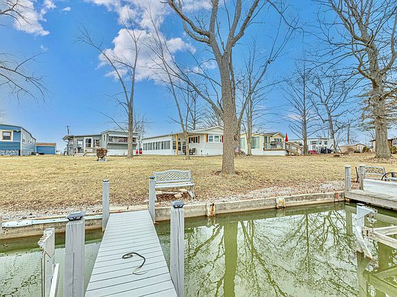 Waterfront home with your double sided dock right out your door! Jump on your boat or jet-skis and enjoy beautiful Indian Lake! Dock includes an electric pontoon lift, a new swim ladder and deck with composite decking. Enjoy the beautiful landscaping from your covered, enclosed lakeside patio additional 300+ sq ft of living space, plus open patio entertaining area, Waterside or from the fabulous sunroom with custom blinds, new thermal pane windows and open views of the lake. This beautiful 2 bedroom, 1 & ½ bath home includes all the decor and furnishings! Newly remodeled, there are too many upgrades to mention inside and out! Includes a full appliance package with new washer & dryer. Natural gas forced air and central air. $850 monthly lot rent includes lawn care, dock and seawall maintenance, boat, jet ski, trailer storage, trash removal. Resort amenities: new pickleball court, basketball court, firepit with built in grill, paved streets, well manicured and maintenance free grounds.All offers are subject to an approved community application. Call today! Pet Friendly!