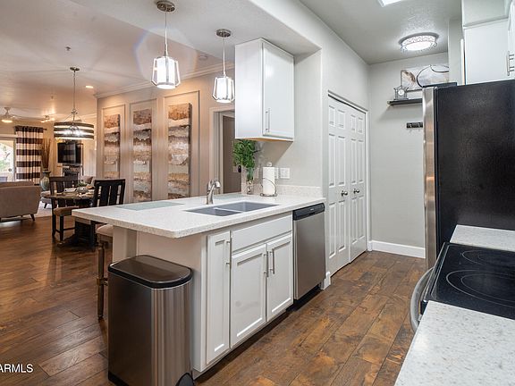 Luxury Turn-Key Condo in Villa Royale, McCormick Ranch! Discover upscale living in this beautifully remodeled 2-bedroom, 2-bathroom condo in the highly sought-after Villa Royale community. Featuring wood floors throughout, elegant quartz countertops, white shaker cabinets, and stainless steel appliances, this home offers a perfect blend of modern sophistication and comfort. The bathrooms have been fully updated, and the spacious, open floor plan is designed for both relaxation and entertaining. This ground floor unit condo includes a 1-car garage and can be sold fully furnished, making it a truly turn-key opportunity for a seamless move-in. Residents of Villa Royale enjoy resort-style amenities, including a heated pool, relaxing spa, and a well-equipped fitness center, all within a gated community for added security and peace of mind.