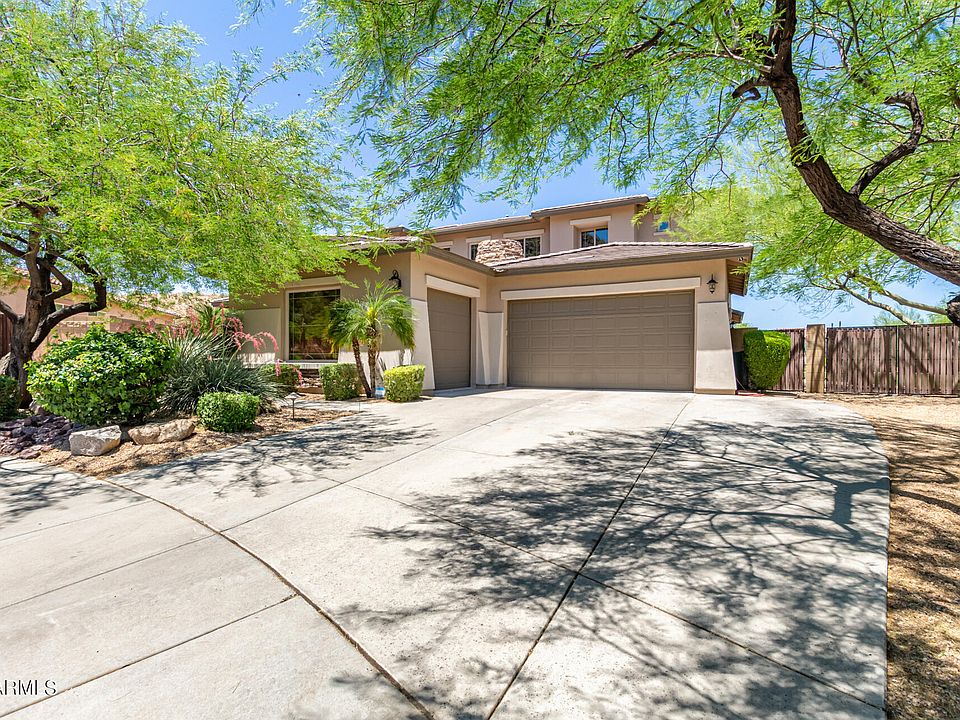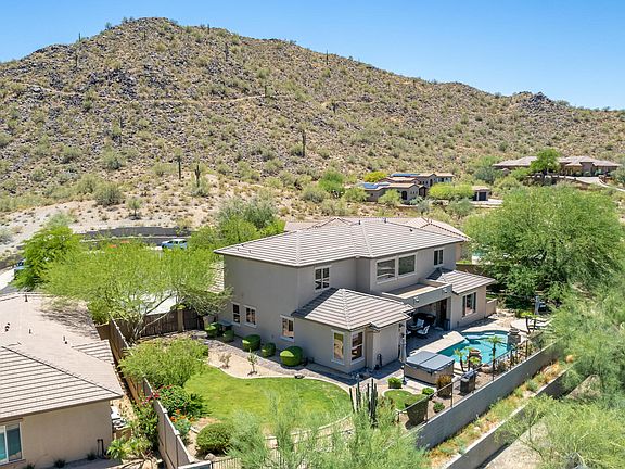 Welcome to this impressive two-story home nestled on a peaceful cul-de-sac with tons of views! Backed to common desert area and one house off the mtn, give tons of privacy. The property's exterior is graced with a private courtyard featuring a cozy fireplace. 3-car garage with an adjoining RV gate is ideal for multiple vehicles. Great negative edge Pebbletech pool and and jacuzzi. Inside, you are greeted by tall expansive ceilings. MASTER bedroom is downstairs. The rest of main level boasts stunning wood-look floors large open rooms and private office. both indoor and outdoor gas fireplaces. Home is great for entertaining and family gatherings. Upstairs you'll find additional bedrooms and game room. The family room is a testament to architectural ingenuity with a striking stone-accented fireplace serving as the room's centerpiece. Pre-wired for surround sound, it's the perfect setting for movie nights or casual lounging. The kitchen is a chef's delight, equipped with recessed lighting that bathes the granite counters in a warm glow. Built-in appliances, including wall ovens, streamline culinary endeavors. The large center island, complete with a breakfast bar, encourages family interactions during meal preparation. An expansive loft offers a place for relaxation, with wide windows letting in plenty of natural light. The main bedroom, conveniently located on the first floor, provides a private retreat with a separate exit. The elegant ensuite bathroom is a sanctuary of luxury, featuring two vanities, a relaxing soaking tub, a dedicated make-up vanity, and a spacious walk-in closet. Venturing outside, the backyard oasis awaits. A covered patio provides the perfect space for al fresco dining or unwinding with a good book. For those hot summer days, the sparkling pool promises refreshing dives and leisurely swims. All this, framed by breathtaking mountain views, will leave you longing for more time spent outdoors! Make it yours today!