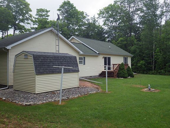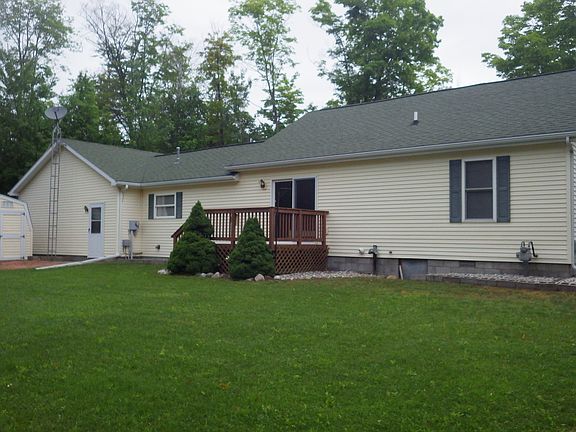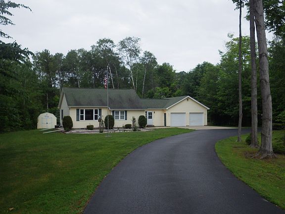 Priced Below appraisal! This is a Frame Construction house, (not a BOCA), with 2 bedrooms and 2 full bathrooms (Master bath: a walk-in-shower, guest bath: a tub-shower combo). The master bedroom is 12' x12' with a 4' x 6' walk-in closet. Guest room only slightly smaller, sized at 12' x 11', with a 2.5' x 6' closet. To top it off house has central air conditioning and forced air heating. An asphalt drive leads to a finished 2 car garage with some cabinetry and workbench. His and her storage sheds (one 12' x 12' the other 8' x 12') for all your toys. Relax on the 8' x 8' deck in the private wooded backyard. Conveniently located close to town with 200 feet of frontage on M-33. Come take a look at your next home!