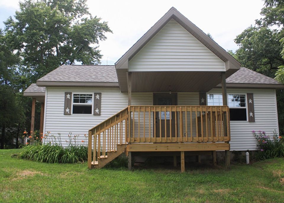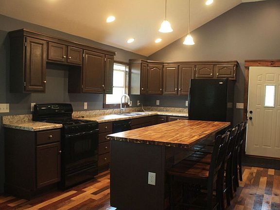 House is located on a hillside with nice view 3/4 in hardwood floors , tiled bathroom, carpet bedrooms, cathedral ceilings thru out house All appliances go with purchase of house