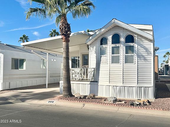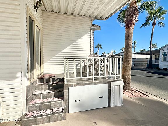 WHAT A BEAUTY this on is! 1 BED/1.75 BATH W/ SPACIOUS AZ ROOM! LOCATED just steps from the Clubhouse, South facing w/ FANTASTIC CURB APPEAL! Step inside & you find an INCREDIBLE OPEN CONCEPT FLOOR PLAN offering a GRAND FRONT KITCHEN perfect for entertaining & cooking up your favorites! TONS of cabinets & GREAT COUNTER SPACE. NEW CONVENTION/AIR FRYER MICROWAVE & SMOOTH TOP range w/ SEPARATE OVEN. WINDOWS GALORE to let the day in! DELIGHTFUL LARGE DINING AREA GREAT for entertaining! Wait until you see this EXTRA LARGE bedroom that allows plenty of space for a KING SIZE bed, TRIPLE MIRRORED CLOSET & ADDITIONAL BUILT IN ENORMOUS DRESSER! lovely EXPANISVE BATHROOM off bedroom area w/ TONS of vanity space, storage cabinets & a TUB/SHOWER COMBO! HIGH CEILINGS in this TURN KEY HOME. LARGE SCALE AZ ROOM ideal for all your visitors, FULLY FURNISHED W/ SOFA SLEEPER & plenty of COMFY furnishings. GIANT closets throughout, you will not run out of storage space! Large 2nd bathroom off AZ room w/ NICE WALK IN SHOWER w/ NEW FULL SIZE WASHER & DRYER! NEW FABULOUS FRONT DOOR, 2 HOT WATER HEATERS & BRAND NEW A/C UNIT. SIT & RELAX on the nice tiled FRONT DECK & enjoy the wonderful AZ weather! WELL MAINTAINED & PRIDE OF OWNERSHIP! SO MUCH TO LIST ON THIS DESERT OASIS! COME LIVE THE LIFESTYLE YOU DESERVE, 55+ RESORT.......OWN THE LAND...OWN THE FUN! THIS IS A MUST SEE!