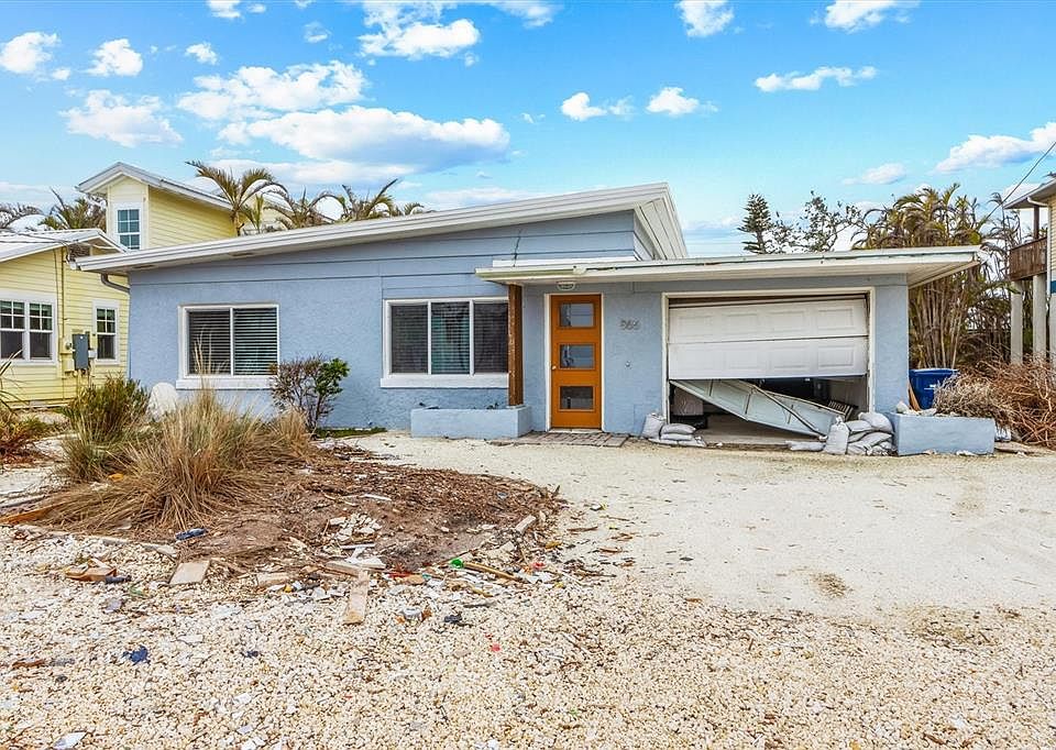 This quaint and charming 3 bedroom, 2 bathroom home is located on the north end of Anna Maria Island and has views of the intercostal.  Damaged by the hurricanes, the home is currently gutted and being sold as-is.  Put back together with your own style and finishes.  Has a cute front Florida room to sit and relax and take in views.  As you enter this mid-century charmer you will see beautiful vaulted wood beam ceilings throughout the whole main living space. The expansive living room opens up to a large dining room. The split floor plan design encompasses three spacious bedrooms with plenty of room for the whole family and two luxurious bathrooms. Complete with plenty of outdoor space, and a large open pergola for entertainment. The pool and spa is a great addition for chill days by the pool and soaking in the sun. This home truly feels like a tropical oasis.  Come see for yourself if the island life is for you, at this beautiful Anna Maria Island getaway.