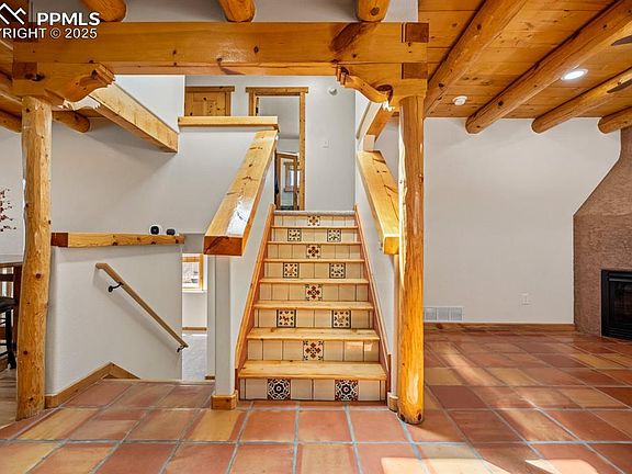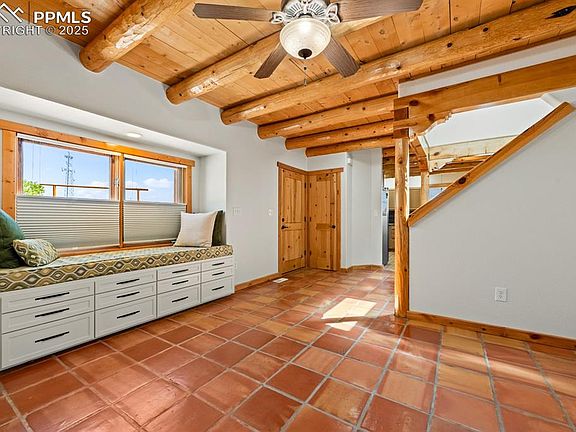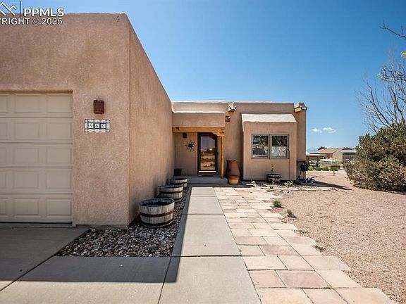 Authentic Pueblo-style tri-level home with quality features throughout. The master bath features a steam shower, a dry sauna, and a soaking tub. The main level features wood-beamed ceilings, a Kiva fireplace, and a built-in window seat. Spacious eat-in kitchen, with Black Stainless Samsung smart appliances, opens to the family room. Situated on 1+ acres, landscaped and fenced with exterior security cameras. Two patios are available: one is located right off the kitchen, featuring a table and chairs, while the other patio is situated under a lighted pergola, already set up with six inviting chairs, a fire pit, and a water feature. This home features solar power, . The property also features a 30x56 garage/workshop with RV parking and hookup, as well as a Morton garden shed adjacent to raised beds, perfect for your garden. Great views and neighborhood—must see!