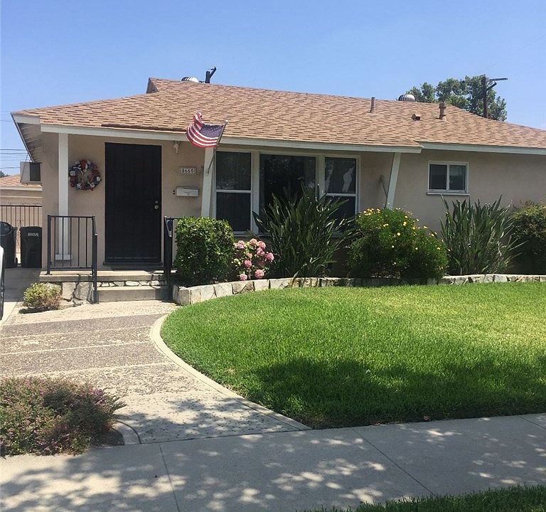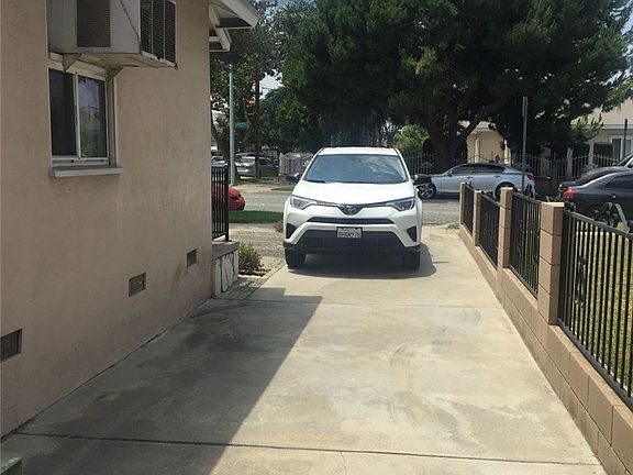 Three bedroom, One full bath has updated flooring. Beautiful Hardwood floors glow in this home!!! Floor furnace in dual setting between hall and living room. Wall Air conditioner in living room. Corner lot with very long driveway for extra parking and two car detached garage with automatic door opener. Built In shed behind garage for extra storage. Large lot with block wall fencing in backyard for a very private park like setting. Covered patio in backyard has a built in fireplace and b b q. Sprinklers front and back yards. Gated driveway. Note: 3rd bedroom currently being used as dining room. Divider is installed for third bedroom usage. Kitchen has been updated and includes refrigerator, dishwasher, washer and dryer. Close to 605 and 5 Freeways. Schools, parks and restaurants are all very close for convenience.