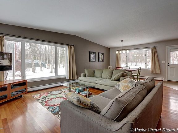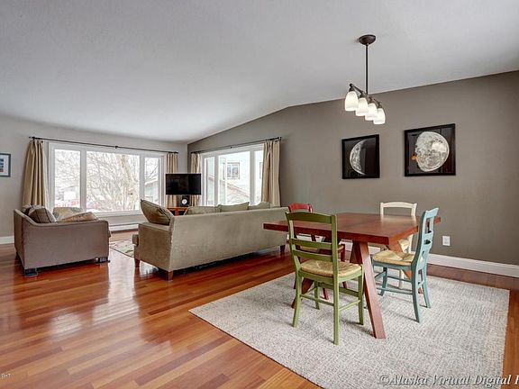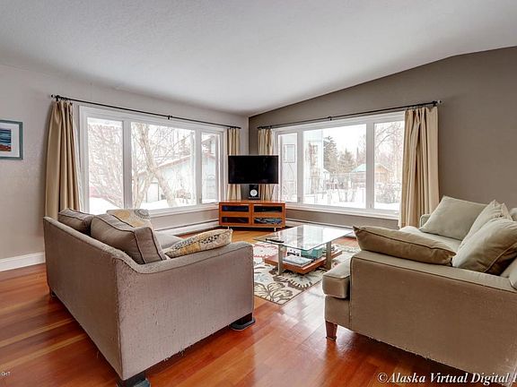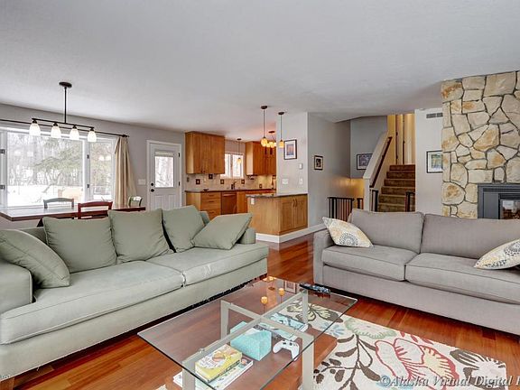 Beautiful Tri-level home on almost a 1/2 acre backs up to Chugach Foothills Park! Warm open LR & DR w/lg picture windows, FP, cath ceilings, hardwood flrs. Kit w/42''maple cab, granite counters & SS appliances. Lower level FR w/wood stove & 1/2 BA. All BR's upstairs, MBR w/his & her closets & private 1/2 BA. Fenced yard w/deck & rare park like location w/access to trails just outside your back door!