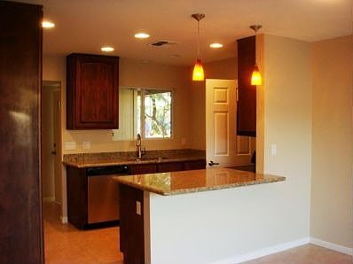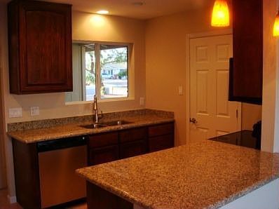 This house has been totally remodeled- nice open layout! Outside see new sand finish stucco; paint, front; back lighting, remote entry garage, clean desert landscaping, block fence in back. Inside find energy efficient dual-pane windows, granite counters and custom stained cabinets in kitchen; bathroom vanities, new toilets; tub, glass shower in master, stainless steel appliances, natural stone fireplace, ceiling fans throughout, kitchen ceiling raised- bright flushmount lights; separate laundry off kitchen, walls freshly textured; painted, enlarged master closet, luxury vinyl flooring throughout the home. Exit to backyard through new dual-pane arcadia door, hot tub. Long driveway; extended 2-car garage.