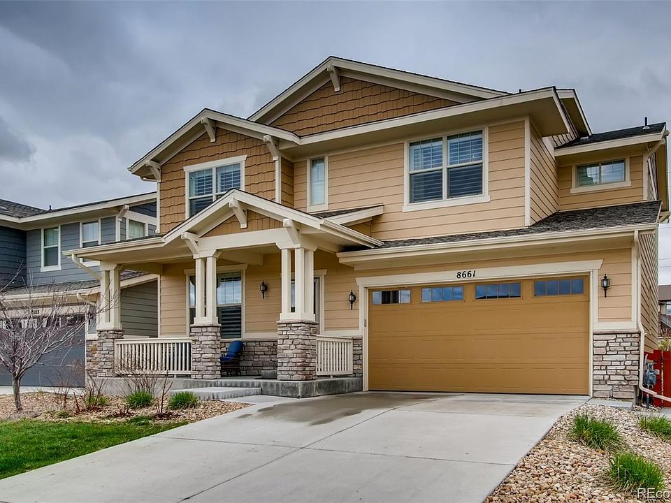 Rare find! Popular two story home with mountain views backing up to the open space with park just down the street! Open floorplan features large living room with cathedral ceilings and cozy gas fireplace, gourmet kitchen with upgraded cabinets, slab granite counter tops, large center island, large pantry and eat in kitchen* also private office/study and guest half bathroom* Second level features private Master suite overlooking the open area with mountains views, a walk in closet and luxurious spa like bath with his and hers vanities and soothing soaking tub and separate shower, two large size bedrooms with full size bathroom and the laundry room* Private yard backs up to the open area with no neighbors in the back featuring large deck which is great for entertainment* Large size basement with rough in plumbing and 9 foot ceilings* Three cars finished tandem garage with lots of storage space* Leyden Rock community is surrounded by excellent rated schools, nearby shopping, parks and trails, access to community pool for the hot Colorado summers. Will not last!