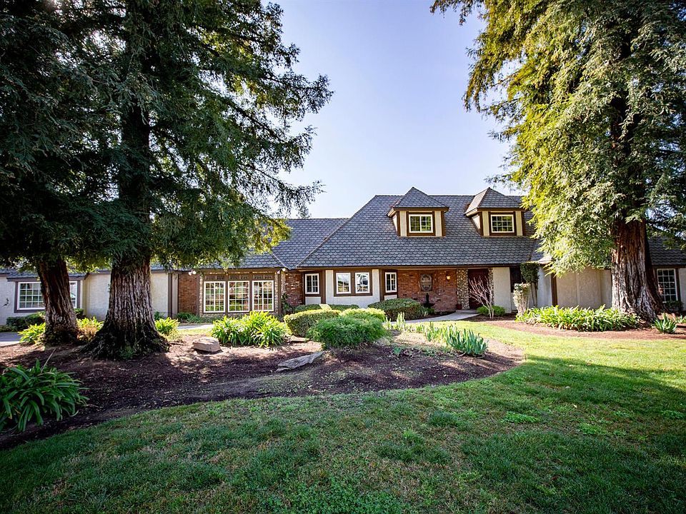 Enjoy this 5 bd/3.5 bath English Tudor-style home perfect for entertaining or relaxing. Near Clovis Hospital, and sitting on 2 landscaped acres, this fully fenced residence has an automated front gate, open floor plan, vaulted ceilings, brickwork, 4 fireplaces, massive balcony deck, attached 3 car garage, inviting Tuscan-style kitchen, and an expansive patio with gas fire pit perfect for guests. Remodeled master has private retreat, dual closets, and oversized shower and slipper soaking tub. There is also an isolated bonus room with private bathroom, gas FP and built-in bookcases. Private 3/1 GUEST HOME with full kitchen, FP, laundry room and patio w/hot tub. Huge insulated barn with mezzanine is separately metered, includes apartment and shop, ideal warehouse space for cars, boat, motorhome or business operations. Separate operational shop with a workshop, and storage. Newer well, HVAC, and updated electrical. Bed/Bath count are diff than tax records, buyer to verify.