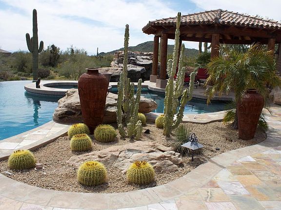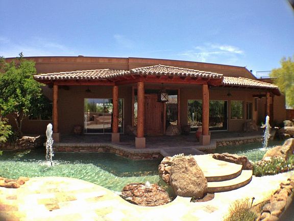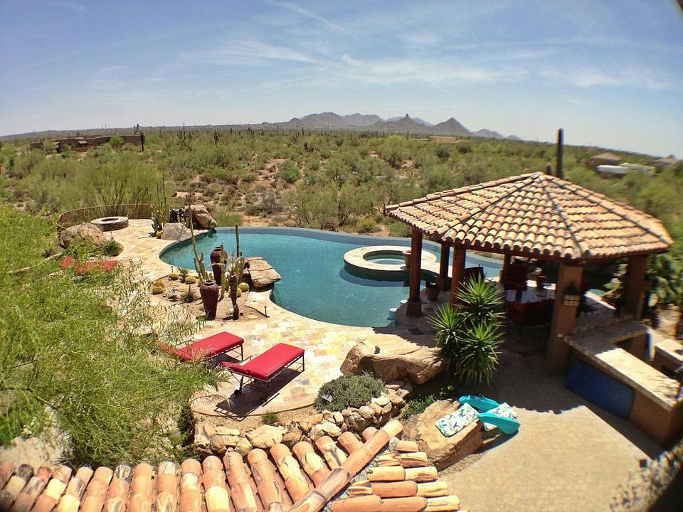 Property includes Parcel 216-52-046 and 216-52-047B Exceptional Home w/a warm feel on 9+ acres -Gated entrance takes you over a bridged pool to a home, unmatched for entertaining -Views of Pinnacle Peak directly south & beautiful sunsets to the West -Pocket doors lead to a large covered patio & out to the lagoon shaped pool & spa w/negative edge & a large rock waterfall -Ramada & outdoor kitchen/bar plus 3 fireplaces on separate patios & entertaining areas -Putting/chipping green on the west side -Bring your Cars and Toys -3405 Sq. Ft. air conditioned garage w/44 ft. bay. More parking/trailer storage outside -Guest parking for 6 guest vehicles on front pavers -Complete remodel and 3000 sf addition in 2002 -Zoned for Horses -Roof top deck gives 360 degree views of N Valle