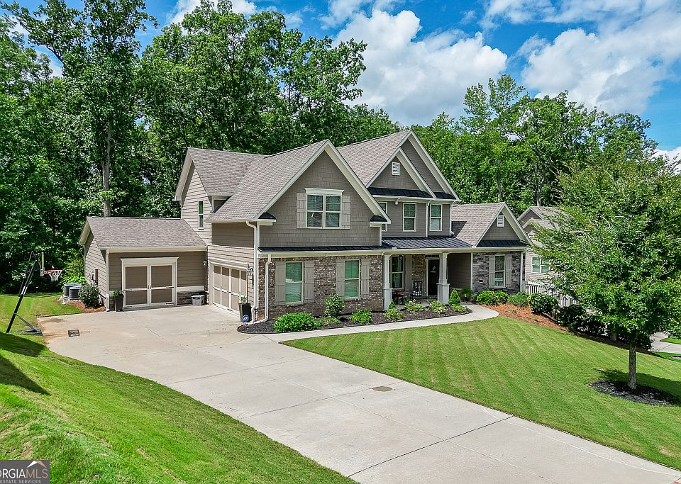 This striking Master on the Main home is perfectly situated on a lovely lot with a beautiful, manicured yard and perfectly level driveway. The exceptional community amenities in River Rock cater to every interest, from a stone fire pit and walking trail along the Etowah River to a large lap pool, kids' splash pad, tennis and pickleball courts, a playground and a well-appointed clubhouse for gatherings and meetings. Step inside and discover a home designed for peace and comfort. The formal dining room sets a sophisticated tone, while the spacious great room, with its rustic stone fireplace, open-concept layout, and beautiful views of the peaceful woods creates a welcoming feeling. The gourmet kitchen is a chef's dream, featuring a massive island, double ovens, and a huge walk-in pantry perfect for creating memorable meals and entertaining guests. Natural light floods the home through a large bank of windows, offering a cheerful, uplifting atmosphere and serene views of the wooded backyard. Step out onto the expansive paver patio where you can relax, read, or listen to the sounds of nature. This tranquil space is a bird watcher's paradise and offers a welcome escape from your long day. The home features generous oversized bedrooms, with a spa like master bathroom retreat. The massive bonus room can be easily transformed into a media room, playroom, or home gym. An added benefit, the home is only six years old, so all major components are nearly new. Come see for yourself why this house feels so much like home.