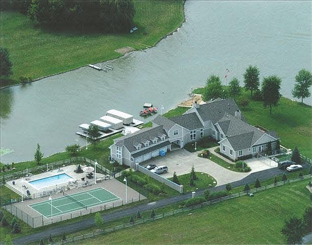 Incredible lakefront resort! Vacation in style with your own beach, heated pool, lighted tennis court, and more than 600 ft of beautiful lake frontage. Two custom kitchens. Huge family room & wrap-around deck. 8-car attached garage. Huge detached garage for your car & toy collection has additional living quarters.