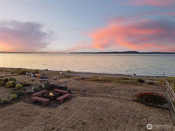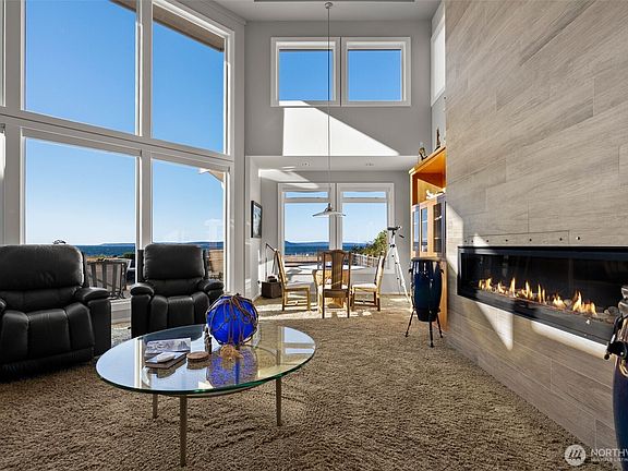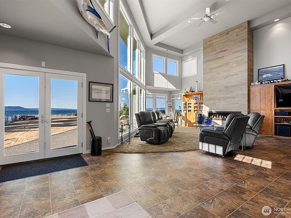 Salt air. Quiet mornings. Endless blue. Immaculate Hansville waterfront home near Point No Point Lighthouse designed for timeless coastal living. This 3,134 sqft home captures sweeping Puget Sound & Cascade Mountain views from nearly every room. The open floor plan centers around a spacious kitchen with a large island & cherry cabinets flowing into the great room anchored by a dramatic tiled fireplace & wall-to-ceiling windows. Lives like a one story- main-floor primary suite features a spa bath, walk-in closet & fireplace with nearby laundry; upstairs, two ensuite bedrooms & an office offer peaceful retreats. French doors open to a fenced yard, fire pit & private beach with direct shoreline access. Never flooded- no king tide issues!