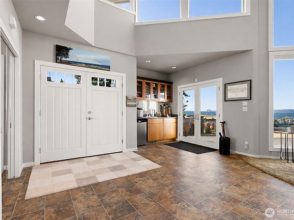 Salt air. Quiet mornings. Endless blue. Immaculate Hansville waterfront home near Point No Point Lighthouse designed for timeless coastal living. This 3,134 sqft home captures sweeping Puget Sound & Cascade Mountain views from nearly every room. The open floor plan centers around a spacious kitchen with a large island & cherry cabinets flowing into the great room anchored by a dramatic tiled fireplace & wall-to-ceiling windows. Lives like a one story- main-floor primary suite features a spa bath, walk-in closet & fireplace with nearby laundry; upstairs, two ensuite bedrooms & office offer peaceful retreats. French doors open to a fenced yard, fire pit & private beach with direct shoreline access. Ideal short term rental or year round living