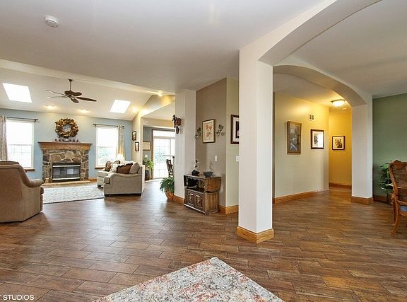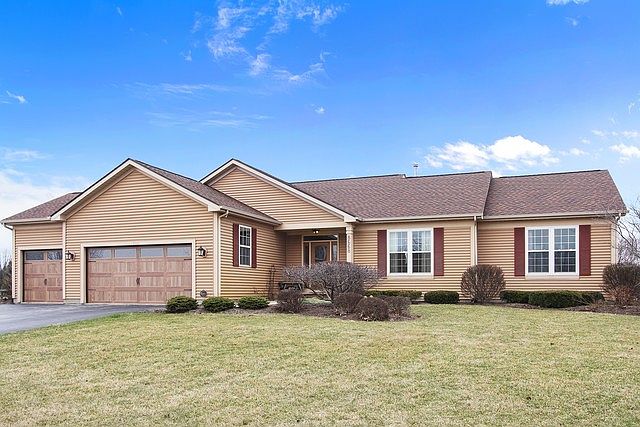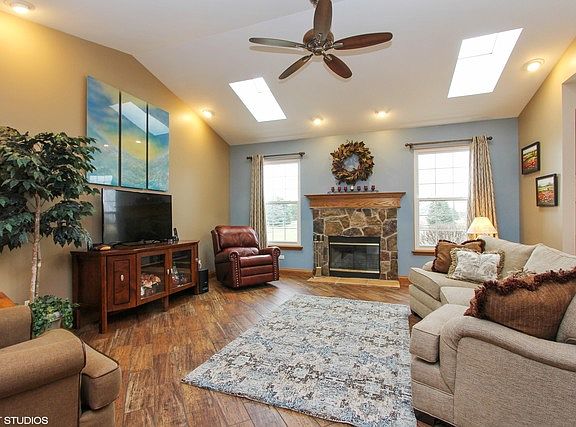 Spacious Ranch Home with Open Layout awaits you in Spring Grove! Gorgeous tile flooring welcomes you into the foyer of this thoughtfully designed home, and leads into the formal dining and living room featuring a stone fireplace with vaulted ceilings and skylights. The kitchen is nicely equipped with new stainless steel appliances, miles of countertops and opens to the eating area and views of the new patio framed by beautiful professional landscaping. The enormous master suite offers a separate sitting area, walk-in closet, and master bath with double sink vanity, Jacuzzi tub, and separate shower. Two additional bedrooms, a conveniently placed laundry room, and three car garage complete this move in ready ranch tucked away on a one acre corner lot ... Welcome Home!
