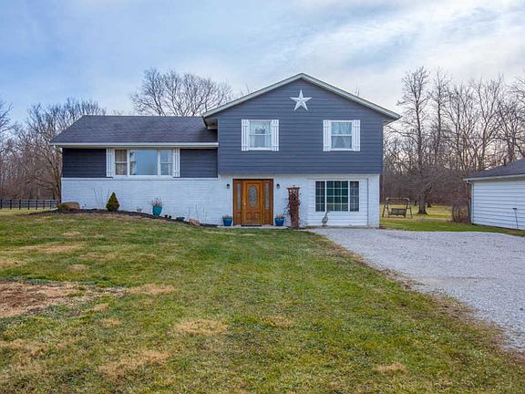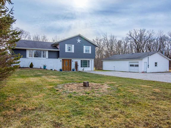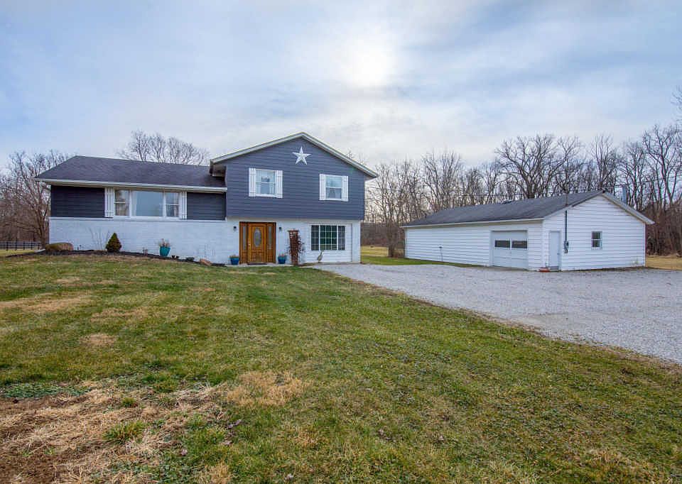 Stylish split-level home in Galion on 3.92 acre tree-lined lot with large outbuilding - great for a workshop! Outbuilding can support 3 vehicles. Main floor office flex space w/ walk-out patio doors. Attached garage converted into oversized main floor bedroom, space for bathroom if desired. Large updated kitchen w/ eat-in & ample cabinetry space. New fridge & dishwasher. Master suite. Updated bathrooms. Large raised deck great for entertaining. Lower covered concrete patio. Sand fire pit. 30-year dimensional roof (2001). Electric heat with Propane fireplace. Stream on lot.