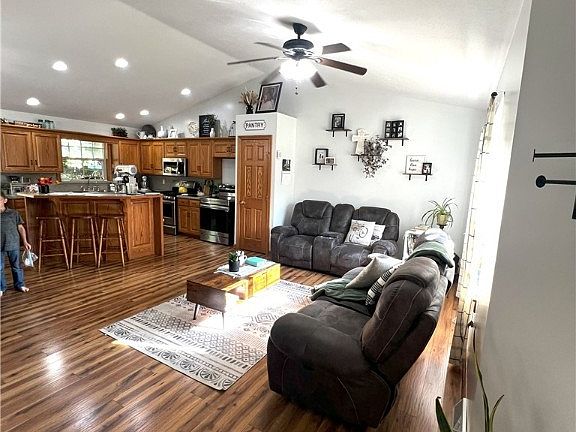 Town living without all of the hustle and bustle! This meticulously kept home, sitting on a peaceful lot, is full of charm from the moment you walk through the door. Upon entering you will find a spacious family room with cathedral ceilings that opens to the eat in kitchen with a large breakfast bar. The kitchen includes stainless steel appliances. Down the hall is the spacious master bedroom with a walk in closet and attached full bathroom. You will also find another bedroom and laundry room on the main floor. Downstairs there is a large carpeted family room, another spacious bedroom, and full bathroom. Off of the finished basement area is an extensive storage area with built in shelving. Outside of the home is a covered front porch and a wooden deck on the back of the home with a pergola that overlooks the trees for tranquil relaxation. The home also includes central vacuum to make cleaning a breeze and a 2 car garage.