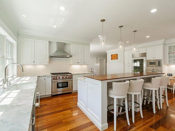 Live your life in a peaceful oasis where high style & brilliant design meets inviting comfort. LOVE everything about this beautifully sited, exquisite Shingle style home--incredible attention to detail w/coffered ceilings, rich HW throughout, beautiful quartz tops and the very best in appliances including Wolf range, Viking wall oven and U-Line wine refrig. Attractive millwork at every turn includes breakfast room banquette to Dining Room wall of built-ins w/glass doors to the organized mudroom. Spend hours in the newly finished sunroom w/bar and access to outdoor patio. Upstairs find master suite retreat w/luxe modern design bath, three add'l BRs, one w/a custom built-in loft bed plus 2 newly finished baths. Many useful spaces for today's living include a LL playroom, privately accessed gym, outdoor kids sports court & play structure plus expanded patio perfect for warm weather relaxation & entertaining. Incredible landscaping on large level yard, just 35 mins to Boston. Welcome HOME!