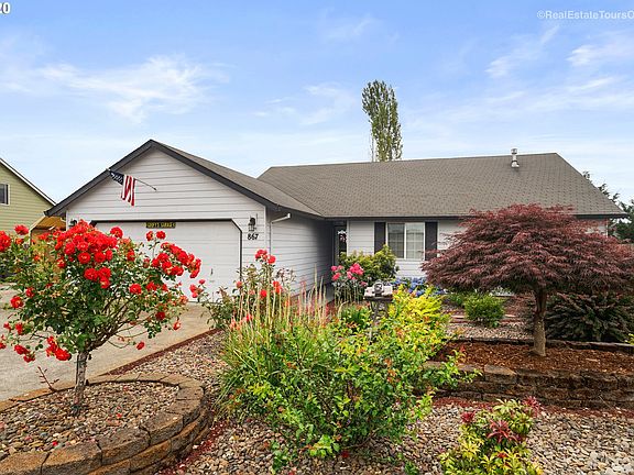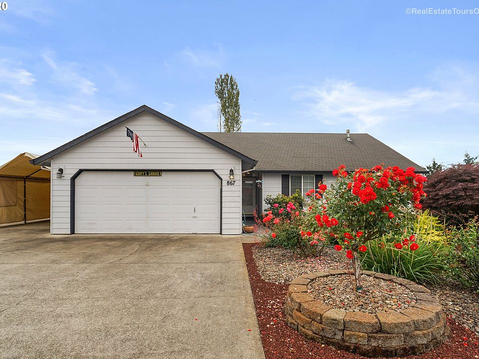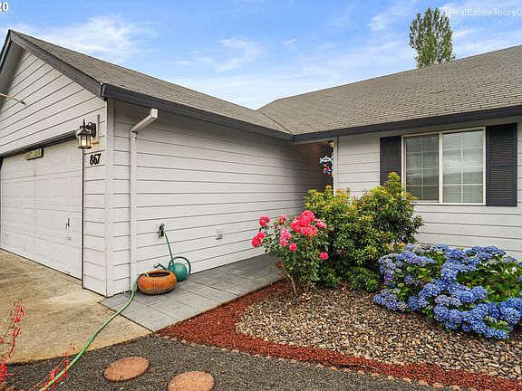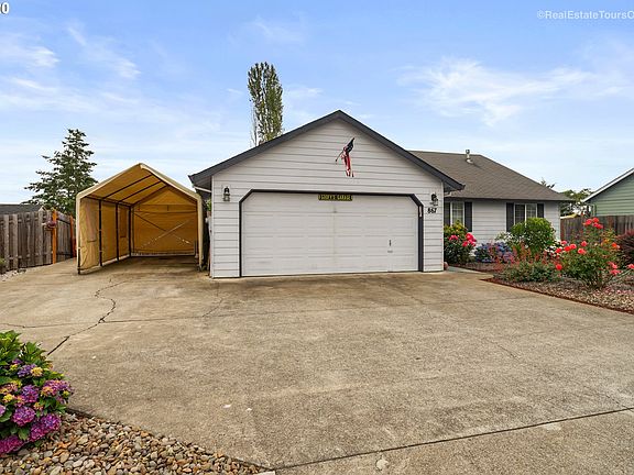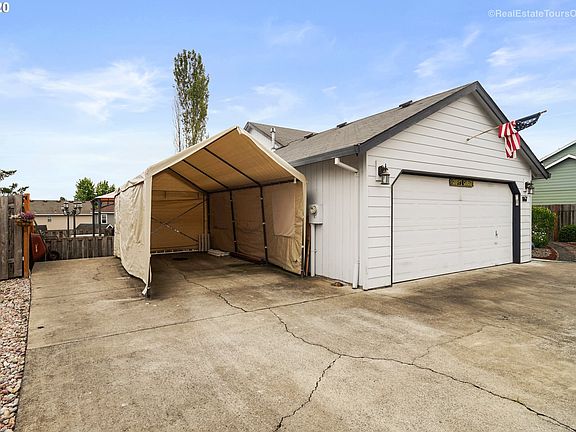 One level great room style home. Kitchen/dining/living room all open to each other. Kitchen has island and three stools for breakfast bar. Interior has carpets and slider to patio. Large patio with umbrella cover. Easy care tiered yard with paths/flowers and bushes. Covered RV parking. 3 bed, 2 bath, move-in ready. 3rd bedroom could be used as a den or office.