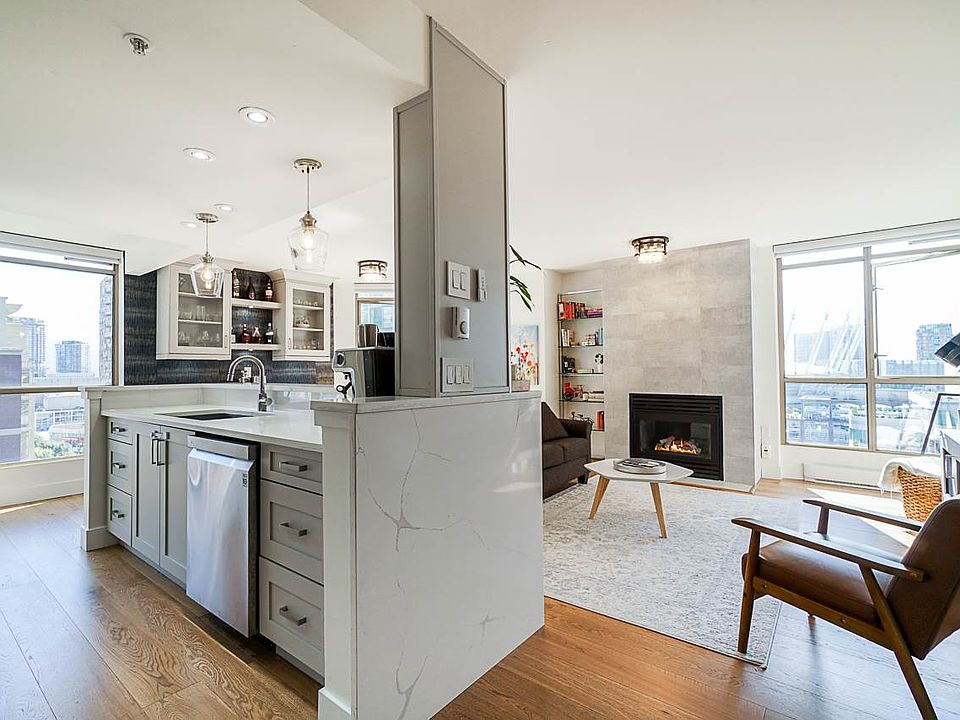 BOSA built this spacious 2bed/2bath which is tastefully renovated from top to bottom w/engineered hardwood, custom millwork & all new stainless steal appliances. The 1088sqft open concept floorplan allows for spacious living room w/gas fireplace, ample dining area w/new built-in china cabinet/bar and huge kitchen w/quartz counters, all new cabinets & breakfast nook. The second bedroom is perfect for a child's room or home office, w/3pc bath. The massive master bedroom features walk-in closet to en suite. Custom solar blinds throughout, parking & storage incld. This North Facing unit has amazing views of the North Shore Mountains. Perfectly located in the heart of entertainment district, close to BC place, Roger's Arena, Library, restaurants & 10 min walk to skytrain, Yaletown, seawall.