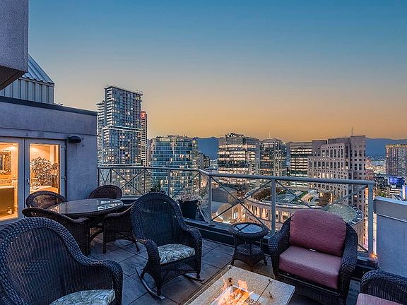 Calling all PATIO lovers! Discover this two-level PENTHOUSE with stunning views of the mountains + water above the City skyline. Equipped with AC + radiant heat throughout, Gourmet kitchen, surround sound system, wet bar w/ tasteful updates including a walnut Murphy Bed, California Closets, wine cooler, sub zero fridge + stainless steel appliances w/ Gas stove. Enjoy views from the expansive patio or from the living room beside the cozy gas fireplace. Four parking spots + storage locker. Enjoy the best of what Yaletown has to offer. The Building is well maintained with newer roof, re-coated stucco, new windows, doors & skylights. Within walking distance to the entertainment/financial district, transit, Robson St & trendy restaurants. Call today for your private appointment.