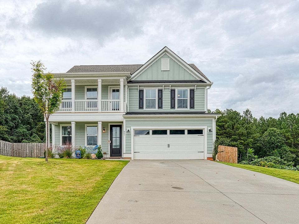 Welcome to Orchard Valley, a sought-after community known for its oversized homesites and quiet cul-de-sac living. This stunning 4BR/3.5BA, 3,040 sq ft Craftsman sits on a .57 acre fenced lot that backs to trees for privacy and play. Inside, the popular Lincoln floor plan offers a main-level owner’s suite with spa bath, plus an open concept design highlighted by a gourmet kitchen featuring quartz countertops, farmhouse sink, extended island with shiplap, double trash pullout, butler’s pantry, and upgraded cabinetry. Acozy gas fireplace anchors the great room, which flows naturally to your large screened-in porch overlooking the expansive backyard — perfect for entertaining or quiet evenings outdoors. Upstairs, three bedrooms each with direct bath access surround aspacious loft with a balcony — ideal for a media room, homework hub, or game lounge. Additional features include tankless water heater, luxury flooring in main areas, dual vanities in all full baths, walk-in closets, and a 2-car garage. Out back, enjoy one of the neighborhood’s largest fenced yards with room for a playset, garden, or pool - a rare find in District 2. Conveniently located near shopping, dining, schools, and major highways, this home blends style, space, and location. Don’t miss this move-in ready gem in Orchard Valley — schedule your showing today!