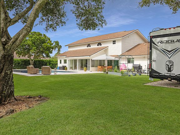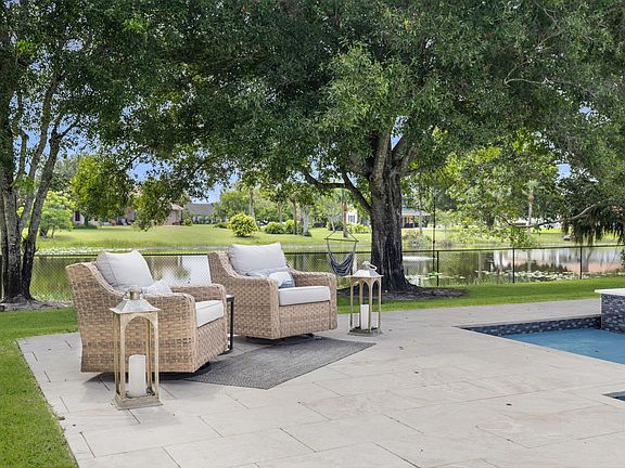 Welcome to this beautiful FRESHLY PAINTED 4 bedroom, 3 and 1/2 Bath Farmhouse on 1.19 acres. As you approach the front porch you are met with stunning cedar posts. Hardwood floors, beautiful wood detailing, crown molding, and all new LED high hats lighting throughout. Spacious master suite on the entry level floor that boasts of a newly renovated cabana master bath. The kitchen has been updated with newer, energy efficient Samsung appliances. Water Heater and all AC units have been replaced. Have a drink in the sunroom while enjoying the gorgeous views of the sprawling backyard, new luxury pool/spa, and amazing evening sunsets on the lake! Great fishing and small non-motorized boating. The back yard is equipped with beautiful landscape lighting, a new irrigation system, RV or boat pad, Generator hook ups, as well as a brand new fence. Enjoy fresh vegetables out of your raised garden beds! The pool has a sun shelf, heated waterfall spa and an eat-in picnic table to relax and enjoy your weekends in! Gated community with low HOA and A rated schools.