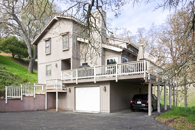 Private setting among the oaks in 3F Meadows.This 3 bed 2 bath home features an office and bonus room that would be a wonderful wine cellar or exercise room. Relax on your deck or in the spa. The outdoor living is very private and perfect for entertaining. The french doors open from the living area onto the deck. Beautiful granite counters and wood floors enhance the kitchen and dining rooms. The wood floors flow into the living area as well. The vaulted ceiling in the living room extends to the second floor and is accented with wood beams.A stone fireplace also graces the room from floor to ceiling. One bedroom and a bath are located on the main floor while two other bedrooms a bath and the office are on the second floor.There is a cozy private deck off the office as well. This is a truly special home loaded with charm.