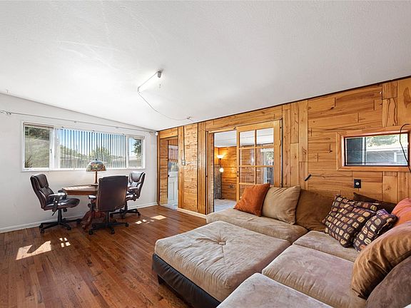Easy care xeriscape front yard landscaping. Large back yard with two storage sheds, large cement pad and outlet for hot tub or RV. Home needs some work. Unique metal trim and wood paneling. Close to downtown and major highways.