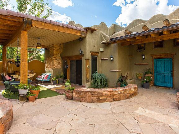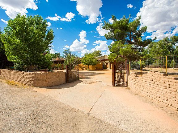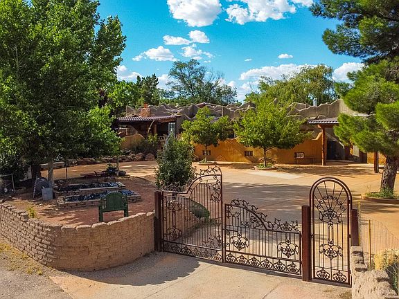 Love the artistic, colorful flair of classic Santa Fe/Taos adobe luxury architecture, but prefer something more centrally located in the Land of Enchantment? In the North Valley's Los Ranchos de Albuquerque, on a full acre of irrigated land along Rio Grande Blvd, this custom, one-of-a kind home and its guardian lizard await you. Walk through the partially covered courtyard, and upon entry to the home you get a sense of spaciousness, whimsy, and Southwest artistry, in the high Viga, Latilla, and Hammered Beam ceilings, exposed adobe and diamond plaster walls, artistic mosaics, and stone floor. Multiple living spaces, indoor and out, make it easy for generations to live together. The loft wing has a separate entrance for a studio, office, or, with a bedroom, bath, living space, and room to add a kitchenette, it could be private living quarters for parents, teens, or adult children starting out. This adobe home is efficient, with radiant in floor heat, and refrigerated air to complement passive nighttime cooling. The garage and workshop, with a half bath, and rooftop deck access for enjoying the night sky or balloons in flight, complete the home. Want more? There's plenty of room to add a pool, barn or both! Come home to the central Rio Grande Valley where you can get more for less and still enjoy the quality and style you expect from a classic Northern New Mexico adobe home.