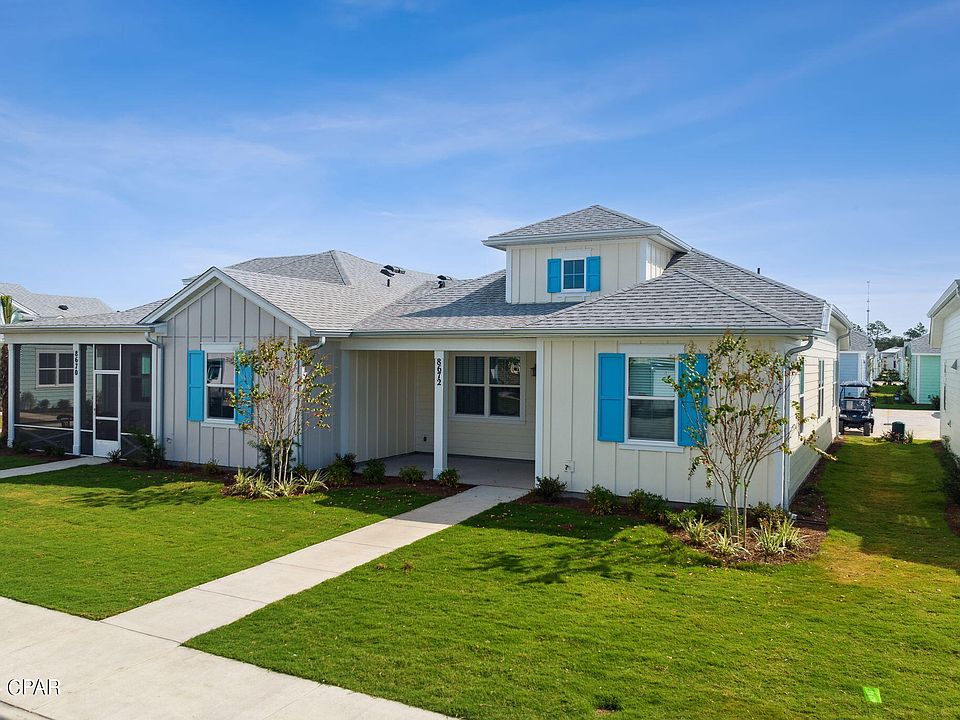 Incredible value with no wait to build! RARE PREMIUM LOT! LARGE front yard with no cottage across from this home. This type of lot provides lots of outdoor space. Gorgeous Coastal Cottage (Camellia Conch Cottage Collection), brand new, never lived in! Peak of pond across the street. Highly upgraded with a tasteful neutral palette. Gourmet kitchen, extended island with quartz countertop, glass backsplash, upgraded cabinetry. Vaulted ceiling Family Room, upgraded Mohawk Revwood flooring throughout the home, Stylist foyer light, navy cabinets in both baths with quartz countertops, Must see this beautiful home in this sought after 55+ community offering a 2 story restaurant perched along the Intracoastal Waterway, resort style pool, indoor fitness center pool, state of the art fitness center, bandshell with dance floor and live music weekly. Daily activities for the residents year round and so much more! 7 miles from the sugar white beaches, shopping, dining, entertainment and all Panama City Beach has to offer. 15 minute drive to ''30A'' with fine dining, boutique shopping and entertainment.