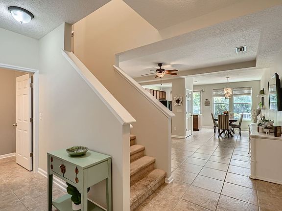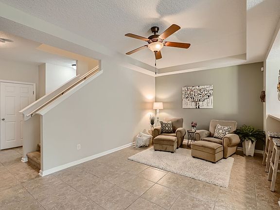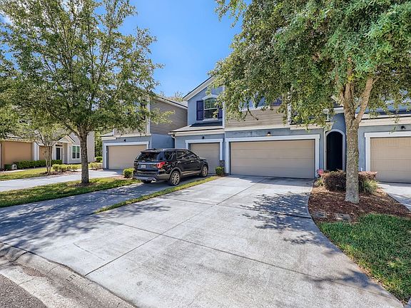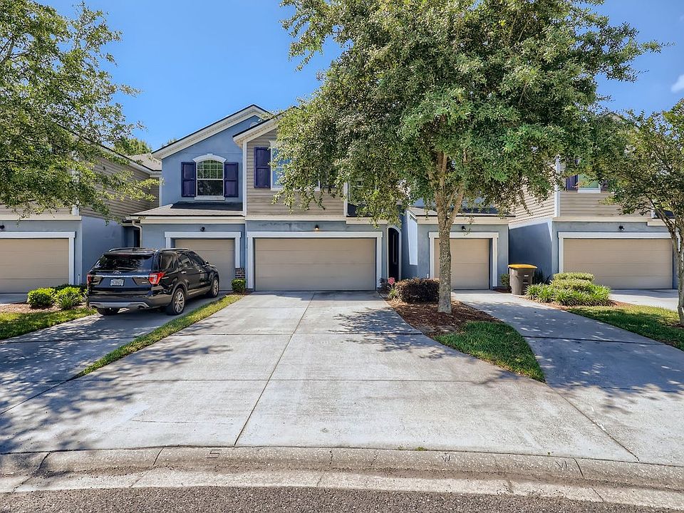 This two-story townhouse is set right at the end of a quiet cul-de-sac and backs onto a preserved area promising added privacy and a picturesque outlook. You will love to gather with guests in the open-concept kitchen, dining, and living room with easy-care tile floors, ample natural light, and direct access to the screened patio. A center island, sleek black appliances, and ample cabinetry will make cooking a joy and there's also breakfast bar seating for casual dining. There are three bedrooms and 2.5 baths including the primary bedroom with a large walk-in closet and a primary bath with a shower and separate garden tub. The list of extra features includes under-stair storage, ceiling fans, and an attached two-car garage. Shopping including the Oakleaf Town Center is within easy reach and you're also just moments from schools, dining options, parks, and the FL-23. Buyer to verify all information.