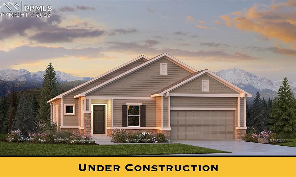 This beautiful 1,607 sq.ft. ranch plan in desirable Academy District 20 sits on a west facing driveway with a fully fenced and landscaped yard and will be complete for closing in February of 2024. This home has a large open concept living/kitchen area, 3 bedroom, 2 bth, plus very nice upgraded features throughout. The easy main level living on slab ranch makes it convenient to walk directly into the home from the garage without stairs to contend with along with wider door ways throughout. The owners bedroom provides a door with direct access to the rear covered patio and back yard. This home will not last long as the price is unbeatable in the new build world in D-20 WITH all landscaping and 6' privacy included.