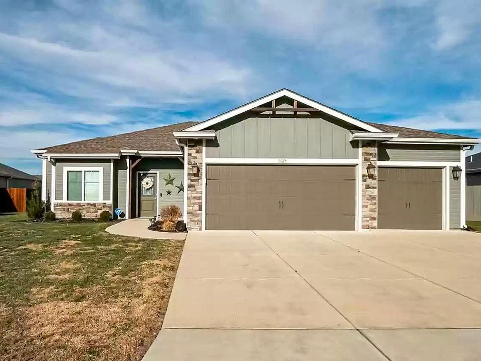 Beautiful Home Near Brand-New Oliver Brown Elementary School! This stunning home is located just a short walking distance from the brand-new Oliver Brown Elementary School, making it a perfect choice for families. With a three-car garage offering ample storage and backyard access, this property is both functional and stylish. Features You'll Love: Spacious Open Floor Plan: 9' ceilings throughout, vaulted living room, and a master suite with a tray ceiling reaching 10'. Gourmet Kitchen: Large island with eating bar, white cabinetry, stainless steel farmhouse sink, travertine tile backsplash, granite countertops, stainless steel appliances, and a pantry closet. Stylish Flooring: Wood-grain laminate flooring throughout the main areas for a sleek, modern feel. Master Suite Retreat: Includes a large walk-in closet, double vanity, tiled walk-in shower, and a natural light accent window. Extra Storage: Bedrooms 2 and 3 each feature walk-in closets, plus plenty of additional storage throughout the home. Outdoor Charm: Stone accents, a covered front entry, and a spacious backyard for entertaining or relaxing. Rental Details: Renter is responsible for all utilities. Pets: Up to 2 pets allowed (under 30 lbs each) with a $500 pet deposit and non-refundable pet fee. No smoking permitted in the house. This home offers the perfect combination of convenience, comfort, and style. Don't wait schedule a showing today and make this house your new home! Renter is responsible for all utilities. Two pets allowed under 30lbs, with pet deposit and non refundable pet fee $500. No smoking permitted in the house.