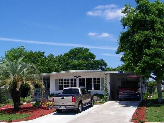 Beautifully updated throughout from floors to faucets, lights to landscaping. Located on the 3rd fairway of a 55+ community where you own your own land. Quality work with rich colors makes this a warm open plan home. Large finished Florida room and screened room and covered porch makes this a relaxing place. Both bathrooms are upgraded and spacious. Wood laminate floors and ceramic tile makes this place shine. Outside shines too with excellent landscaping, palm tree and flowers, and a chain-l...