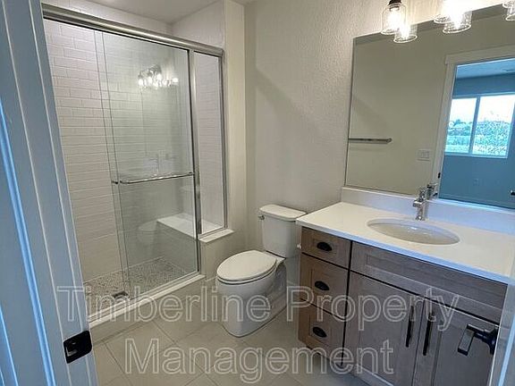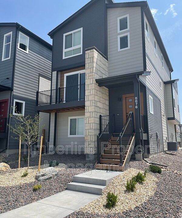 Unobstructed mountain views throughout! Gorgeous modern style home with 2-car garage in the new Midtown Collection at Wolf Ranch. Situated in the award-winning D-20 school district. Located minutes from the Powers Corridor with easy commute to Military Bases, I-25, and various shops, restaurants and services. A 5-minute walk takes you to the community pool, dog park, playgrounds and Legacy Peak Elementary. You'll love the low maintenance yard with immediate access to open land with 10+ miles of walking/running trails. 14-acre Wolf Lake is a 1.5 mile drive or walk through open space, catering to recreational boating and stocked for fishing. Inside you'll find large windows with plenty of natural light and range views from almost every window. Open concept living on the second level includes a beautiful gourmet kitchen with upgraded stainless-steel appliances, living room, walk-in pantry, half bath, and dining area with access to the balcony overlooking the community pool and taking in gorgeous Pikes Peak views. The lower level of the home includes access to the garage and the 4th bedroom with ensuite bathroom and mud set walk-in shower. On the upper level, you'll love the large, bright master bedroom, the master bath with double vanities, walk-in shower and large walk-in closet. 2 other bedrooms, full bathroom and laundry are conveniently located on the same floor. Amenities: sprinkler system, central air, d20 schools, community pool, unobstructed mtn view, schools nearby, wolf ranch, easy commutes to military bases
